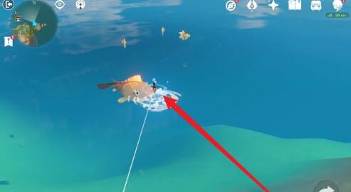 2、然后在任意的炮鲀钓鱼点,放下鱼竿,等待鱼儿上钩即可,这个鱼是圆圆的橙色,比较好钓。
