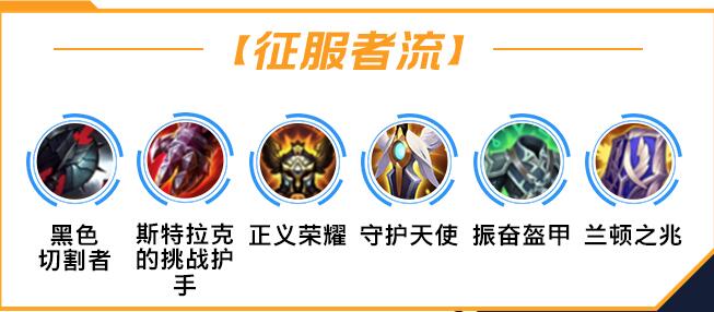2、征服者流:黑色切割者+斯特拉克+正义荣耀+守护天使+振奋盔甲+兰顿之兆