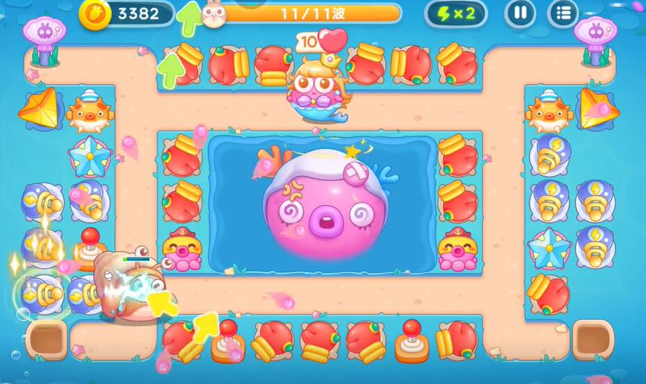 6、在右上角建造河豚和纸飞机清理兔子和右上角的障碍物,随后在右上方建造一个拳套进行输出。
