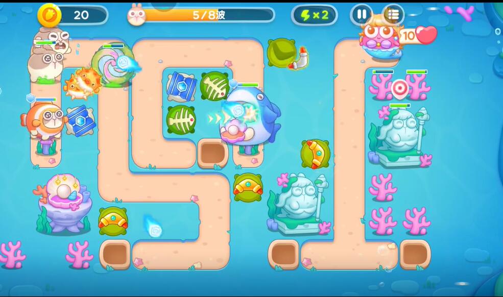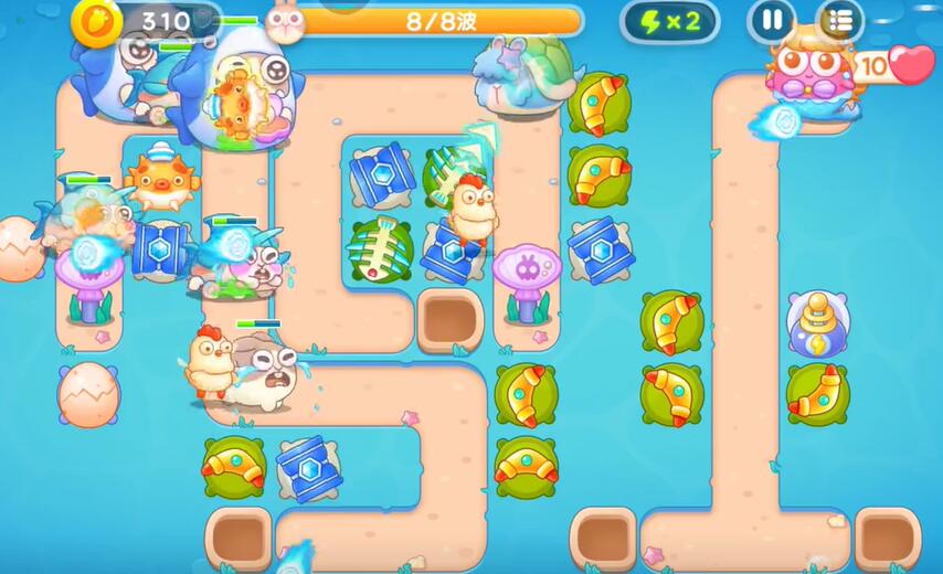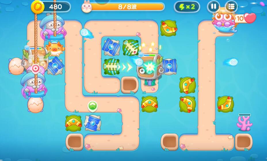 1、在左侧出怪口处建造一个双向塔清理上方的障碍物,随后对兔子进行攻击,随后在下方建造一个回旋镖处理障碍物。