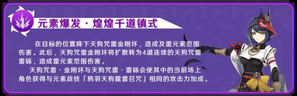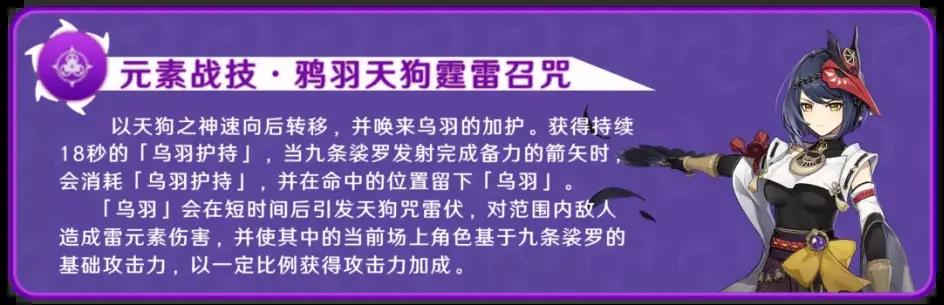 2、e技能:元素战技招来乌羽的护,对敌人造成雷元素伤害;