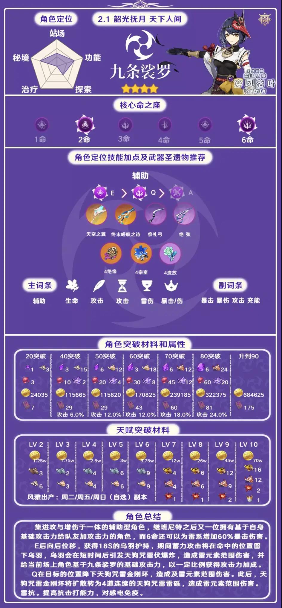 1、首推天空之翼,九条主要走辅助流派,可以提升充能,加雷伤;