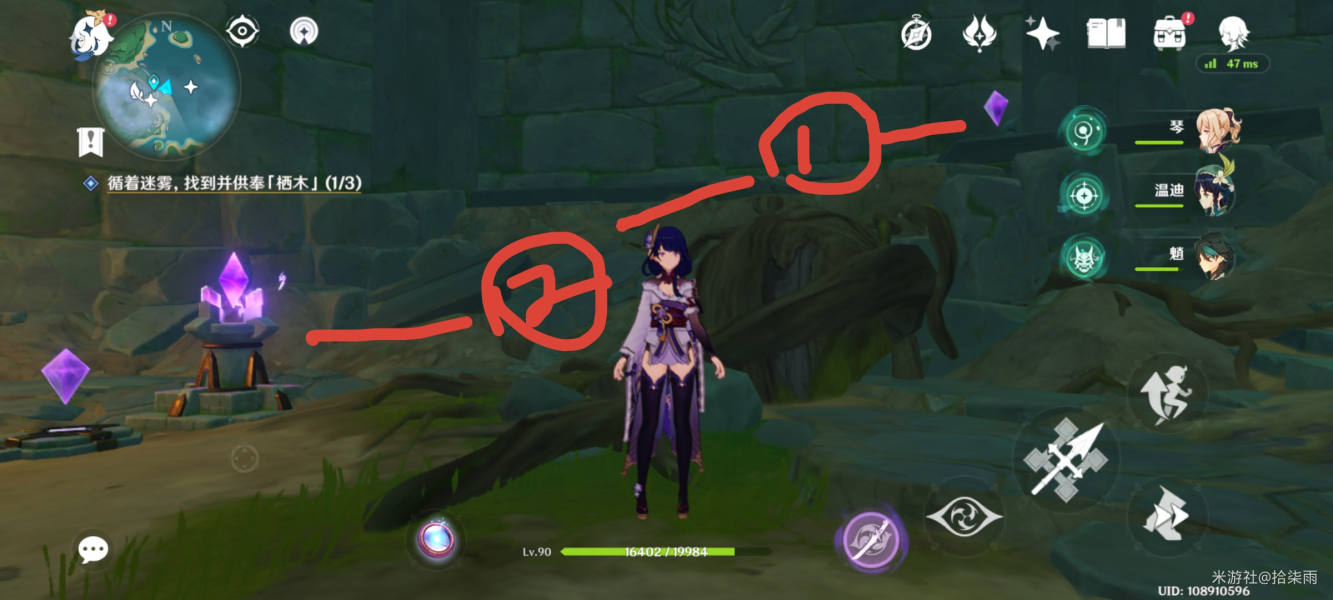 3、最后一处栖木的位置隐蔽,而且地势较高,也是打开元素视野,跟着雷灵跑。