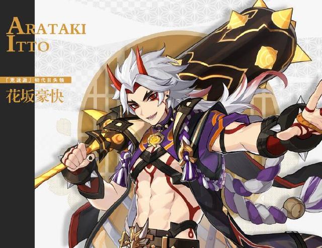 1、荒泷一斗是五星角色岩元素角色,这个角色拿着大棒,提瓦特首位猛男;