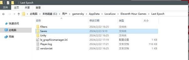 2、玩家需要找到这里的存档位置,存档的位置在C:\Users\你的用户名\AppData\LocalLow\Eleventh Hour Games\Last Epoch\Saves的文件夹里。