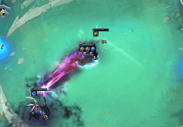 冲向敌人最密集的区域,对2格内的敌人造成300/450/1500魔法伤害。每击中一个敌人获得175/225/500护盾,持续2秒,并降低他们10%的伤害,持续4秒。