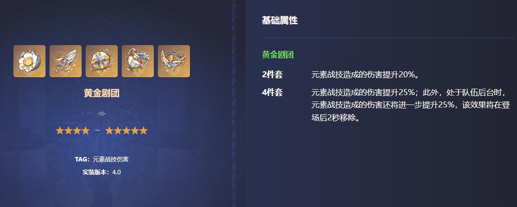 解析:提供了两个套装两件套的效果,提供了30%的防御力和20%的元素战技伤害,能够当做过渡的圣遗物进行使用。