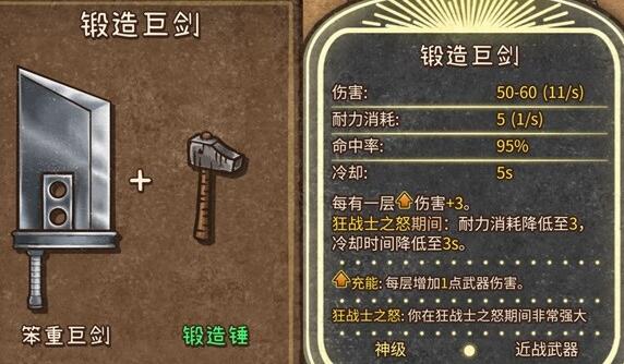 5、锻造巨剑(神级,近战武器):笨重巨剑+锻造锤