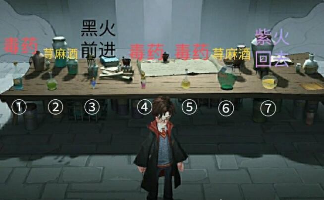 如图所示已经给大家标好了所有的药剂类别,我们让赫敏喝下七号药剂进入紫火门,哈利则是喝下三号药剂进入黑火门,开始下一个支线。