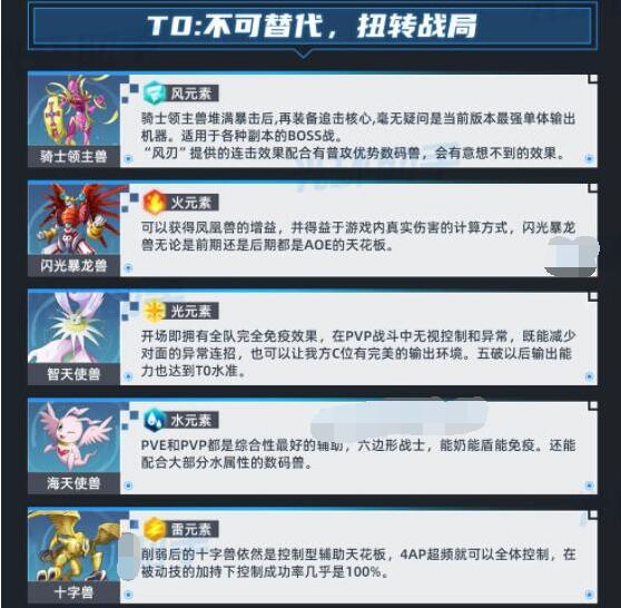 分析:T0的数码兽都是比较强大的,可以帮助玩家轻松扭转战局,在队伍中属于不可替代的地位,玩家完全可以放心的培养TO数码兽,绝对不会亏得。