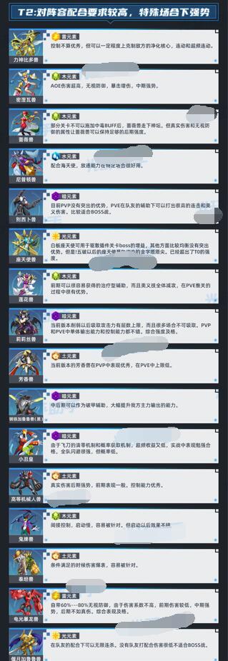 分析:T2的数码兽则对于阵容的配合要求更高了,需要一定的特殊场合才可以发挥出最强大的实力,比较考验玩家的阵容组合能力,将一些技能搭配起来有特殊效果的T2数码兽进行阵容组合使用会有奇效,当然要是阵容不齐的话还是不要单上了,推荐配齐阵容再上。