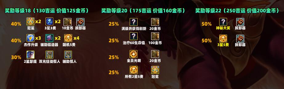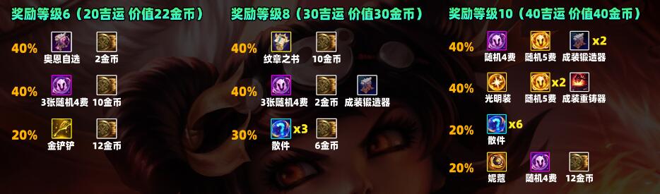 40吉运(价值40金币):奖励:2*成装、4费、5费(30%)、光明装、2*5费、重铸(30%)、6*散件(20%)、妮蔻、4费、12金币(20%)