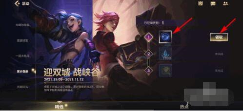 3、一共是3天的登录签到任务,第一天登录签到即可领取海克斯水晶,点击领取。