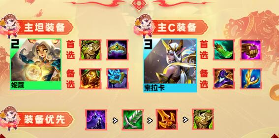 2、主坦:妮蔻或是戴安娜:狂徒铠甲+离子火花+日炎/冕卫,离子火花保障索拉卡的输出,狂徒提供血量,剩余的一键装备更具阵容来选择不同的肉装。