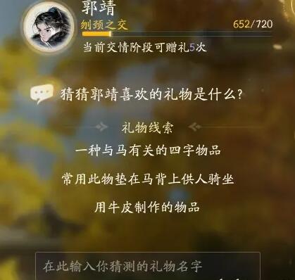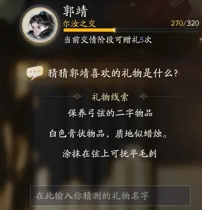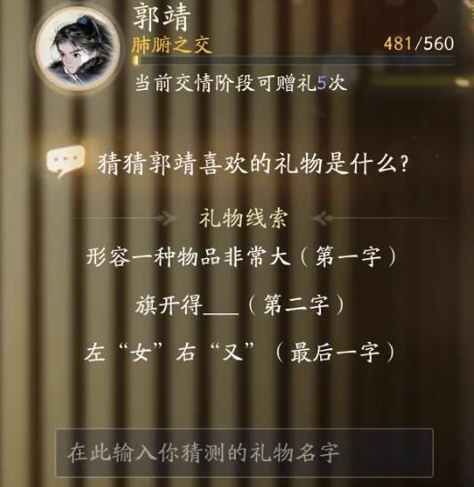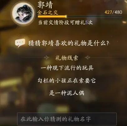 在射雕这款游戏中可以给npc赠送礼物,有很多的玩家都非常的好奇郭靖喜欢的礼物是什么,比如蒙古弯刀、金疮药等道具,玩家需要根据提示输入正确的内容,更多的内容可以在这篇郭靖喜欢的礼物答案一览之中进行里了解,让我们一起来看看吧。