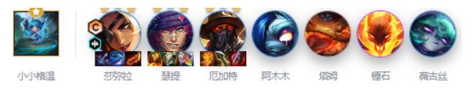 1、成员:莎弥拉+瑟提+厄加特+阿木木+塔姆+锤石+薇古丝