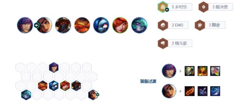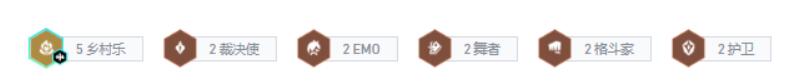 2、羁绊:5乡村乐、2裁决使、2 EMO、2舞者、2格斗家、2护卫