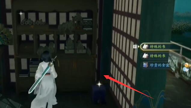 4、来到右侧墙角的这个书架,在这里也有两本特殊的书籍可以拾取,还有一个珍贵的食盒。