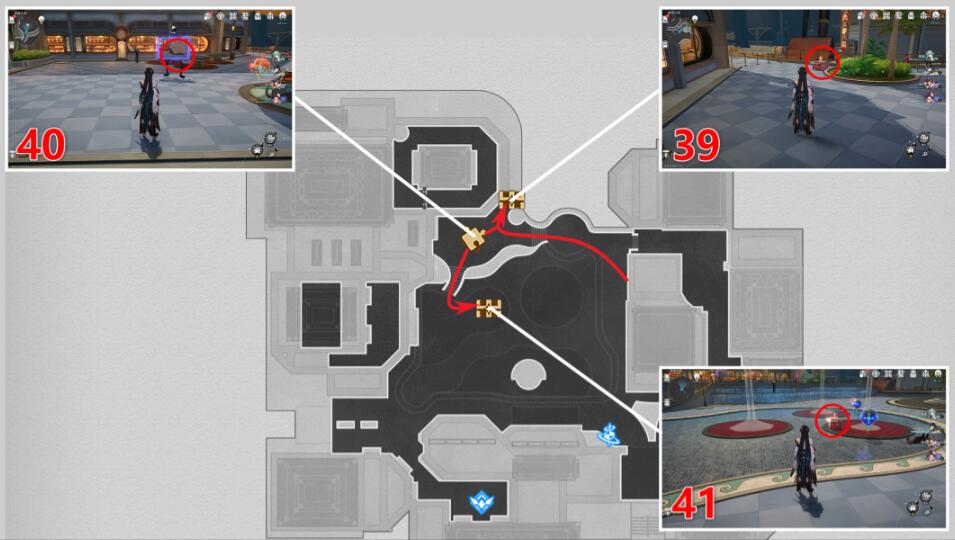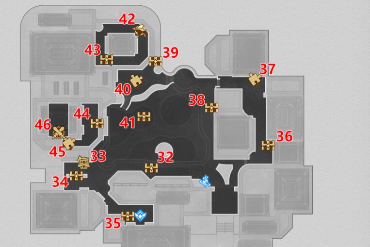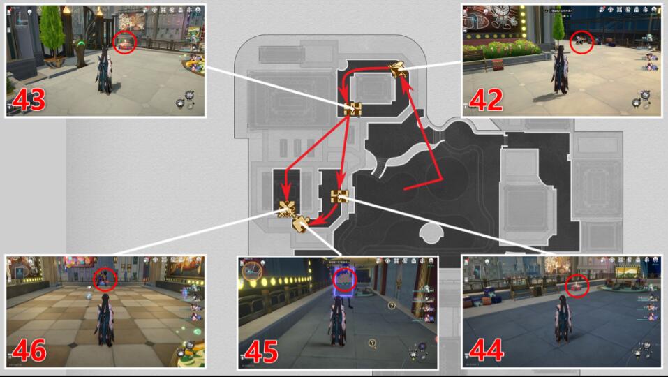 注:42号宝箱需要拿完41号宝箱,借助弹珠机飞上去。45号宝箱需要拿完43号宝箱之后,借助弹珠机飞过来,46号宝箱需要玩家拿完45号宝箱之后,返回北边的弹珠机,再借助弹珠机飞过来。