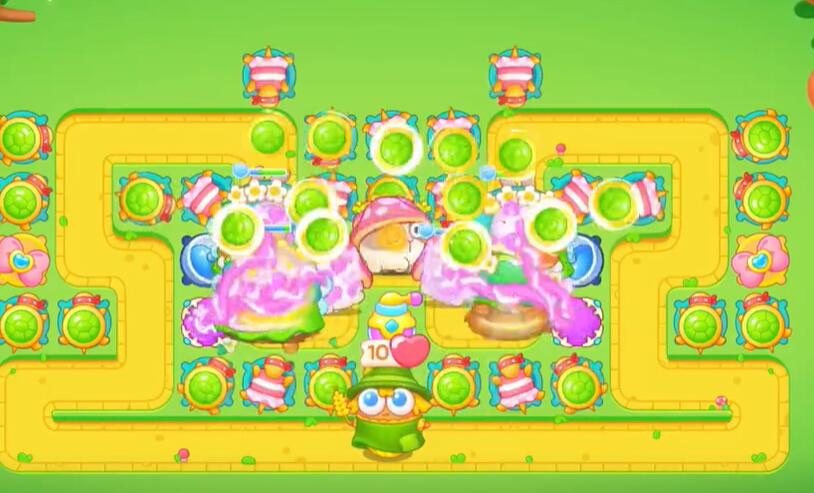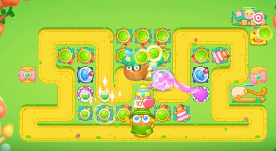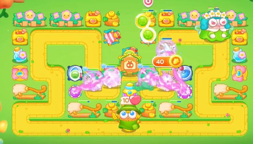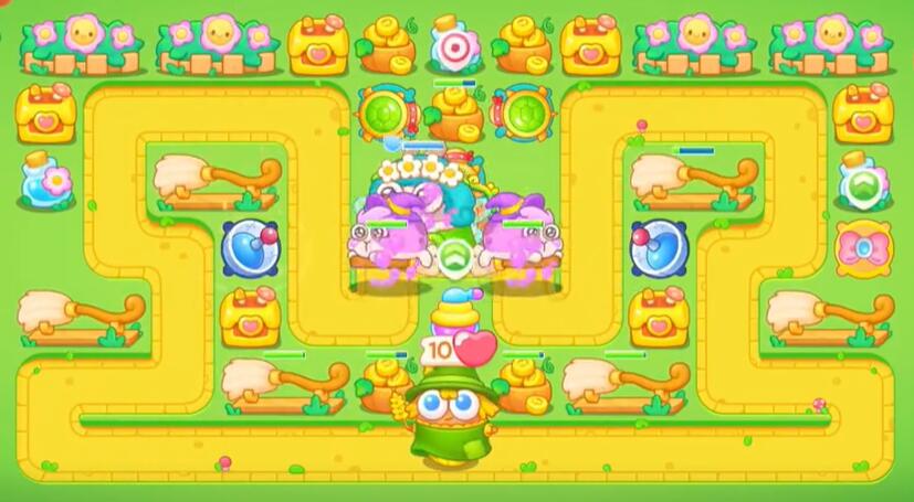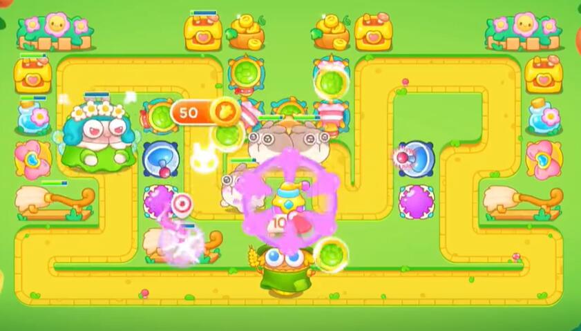 2、在地图上方的出怪口建造两个乌龟攻击兔子同时摧毁障碍物。