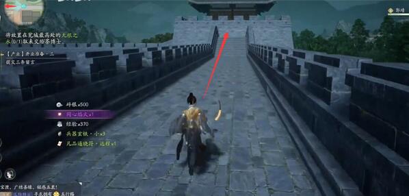 3、来到城墙上之后,沿着提供的这条路向西走,来到房顶。