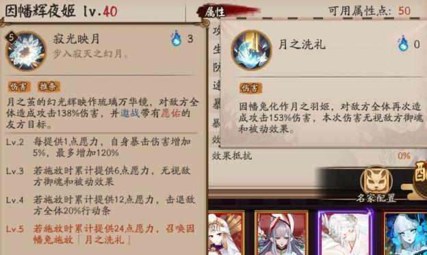 Lv.5 若施放时累计提供24点愿力,召唤因幡兔施放月之洗礼(对敌方全体再次造成攻击153%伤害,本次伤害无视敌方御魂和被动效果)
