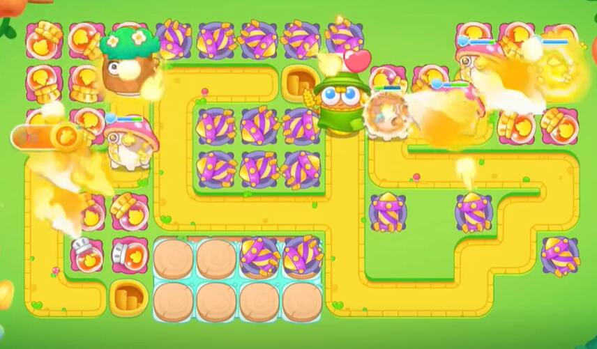 4、在左上角结合右上角建造火焰瓶,对障碍物进行攻击,并且在下方补充烟花塔攻击兔子。