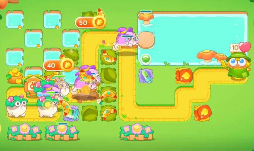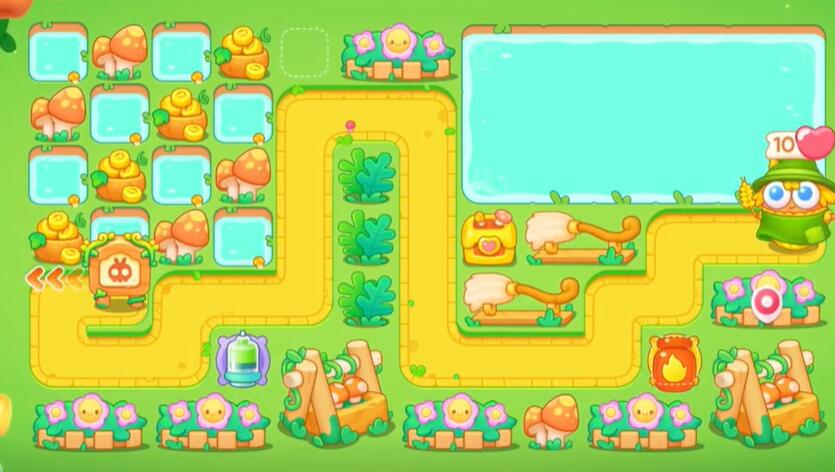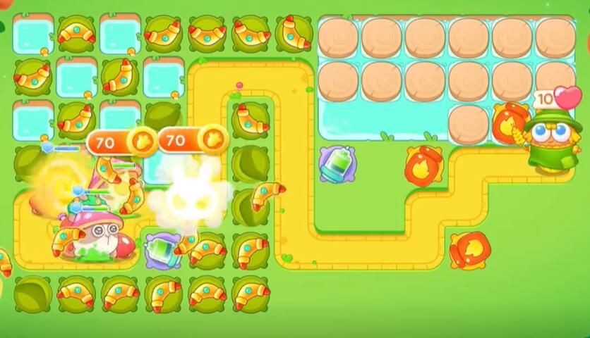 2、在右下角建造喷火器清理障碍物,升级关卡提供的针管攻击兔子。