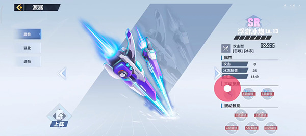 主动技能:召唤炮,射出两道光线,冰冻前方目标和水面,持续战斗30秒,冷却50秒。