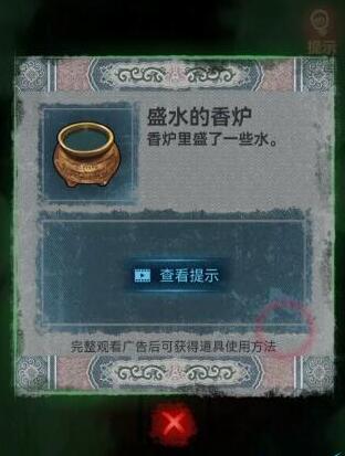 4、在城隍庙点击最中间桌子,在桌面阴世录旁拿个空香炉,用空香炉点击水缸即可获得水。