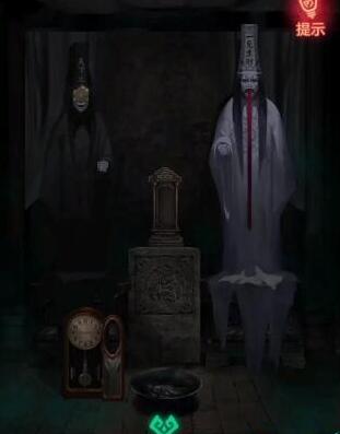 11、我们到城隍庙左门,拿令牌获得提示,根据提示调整时钟即可获得符纸人,我们按步骤把符纸人放中间案台上点击中间画写状子。
