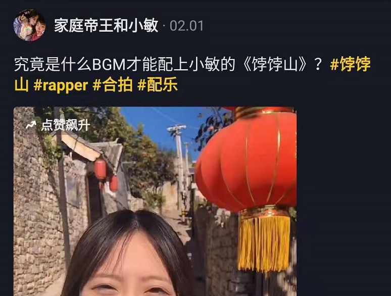 改梗出自短视频博主“家庭帝王和小敏”,视频中的小情侣来到饽饽山旅游,女主角小敏即兴freestyle了一段:“老公,你看这有个饽饽山,小敏去,饽饽山上摘饽饽给老公吃饽饽,给老公吃饽饽,吃完饽饽回家小敏给老公饽饽”