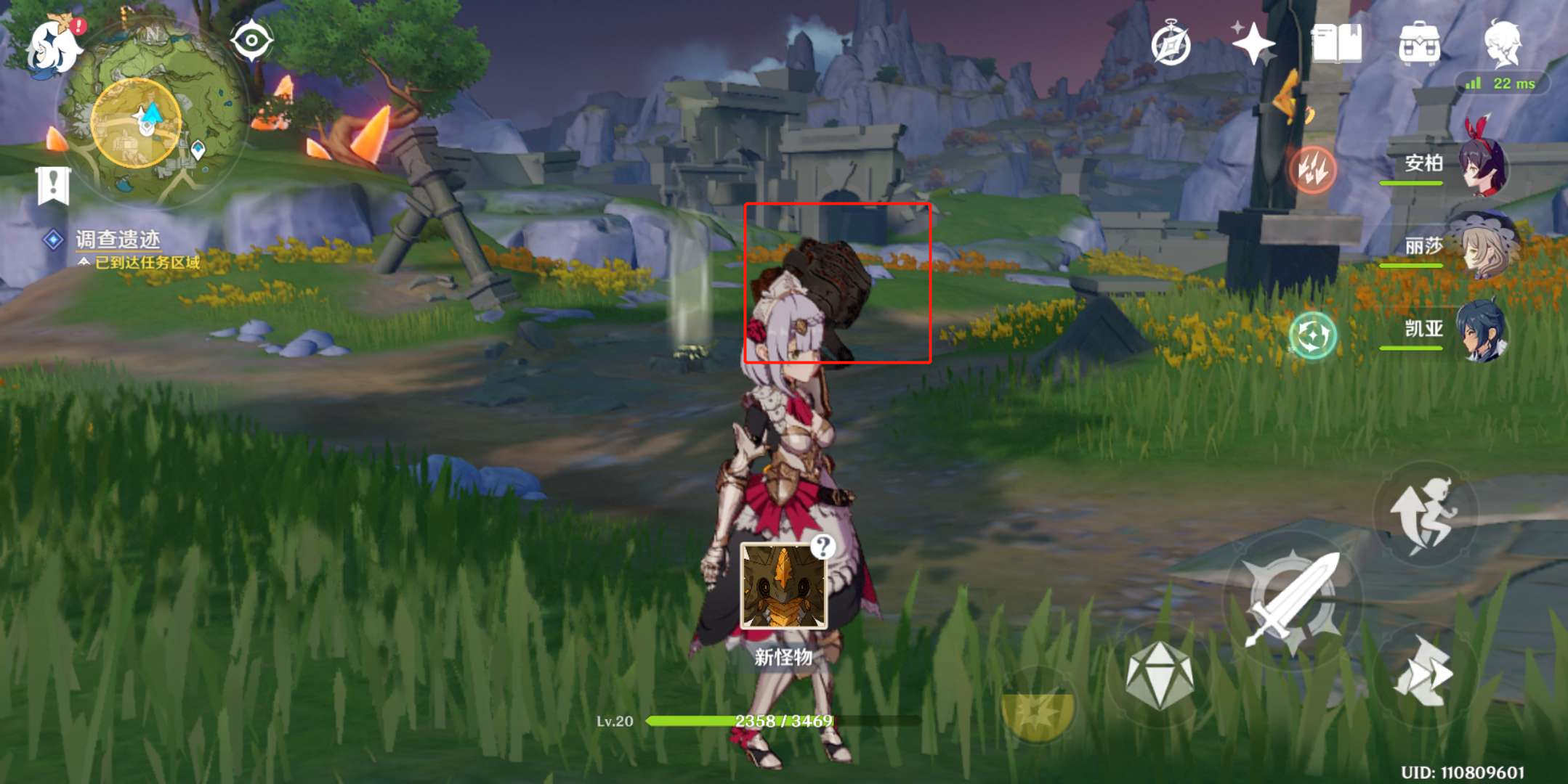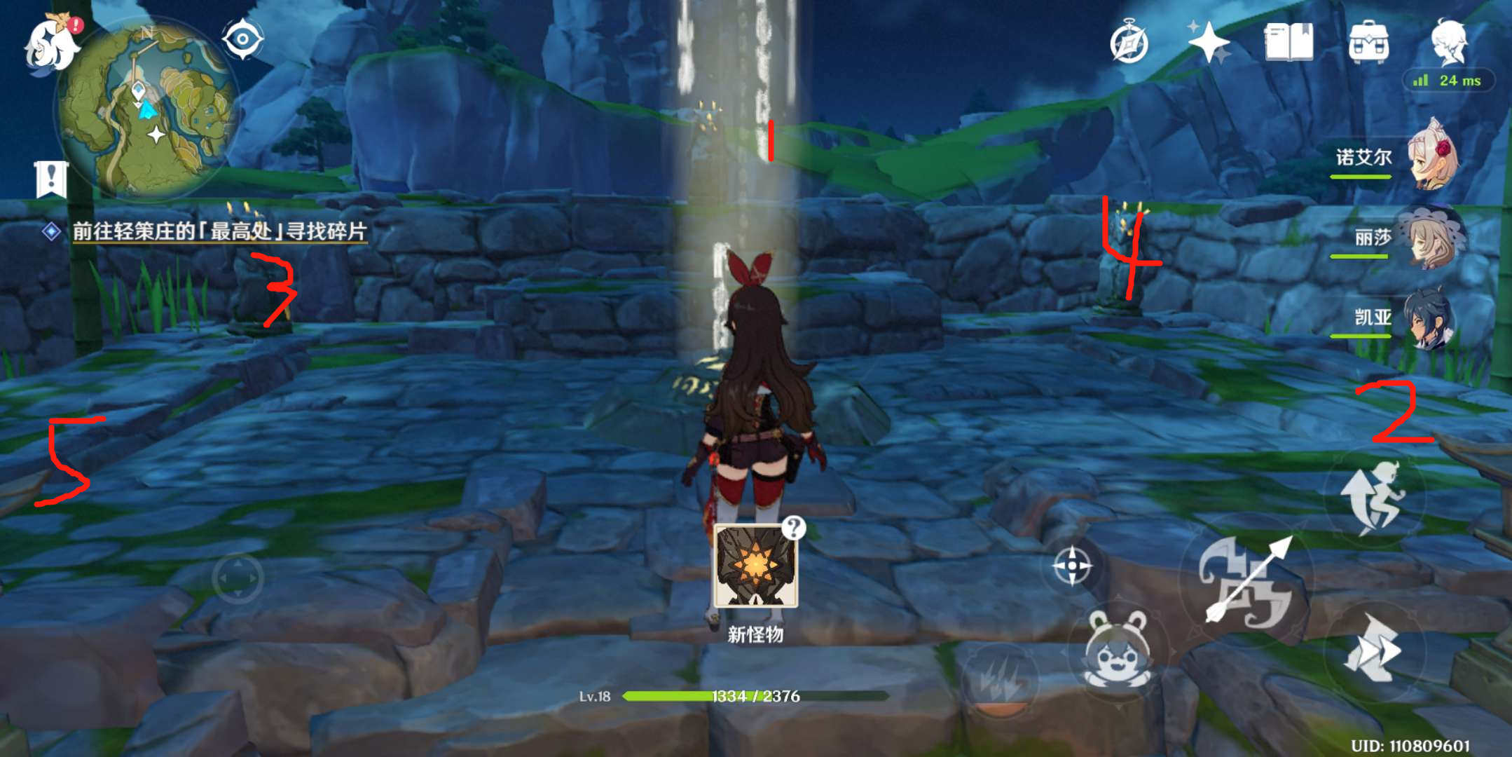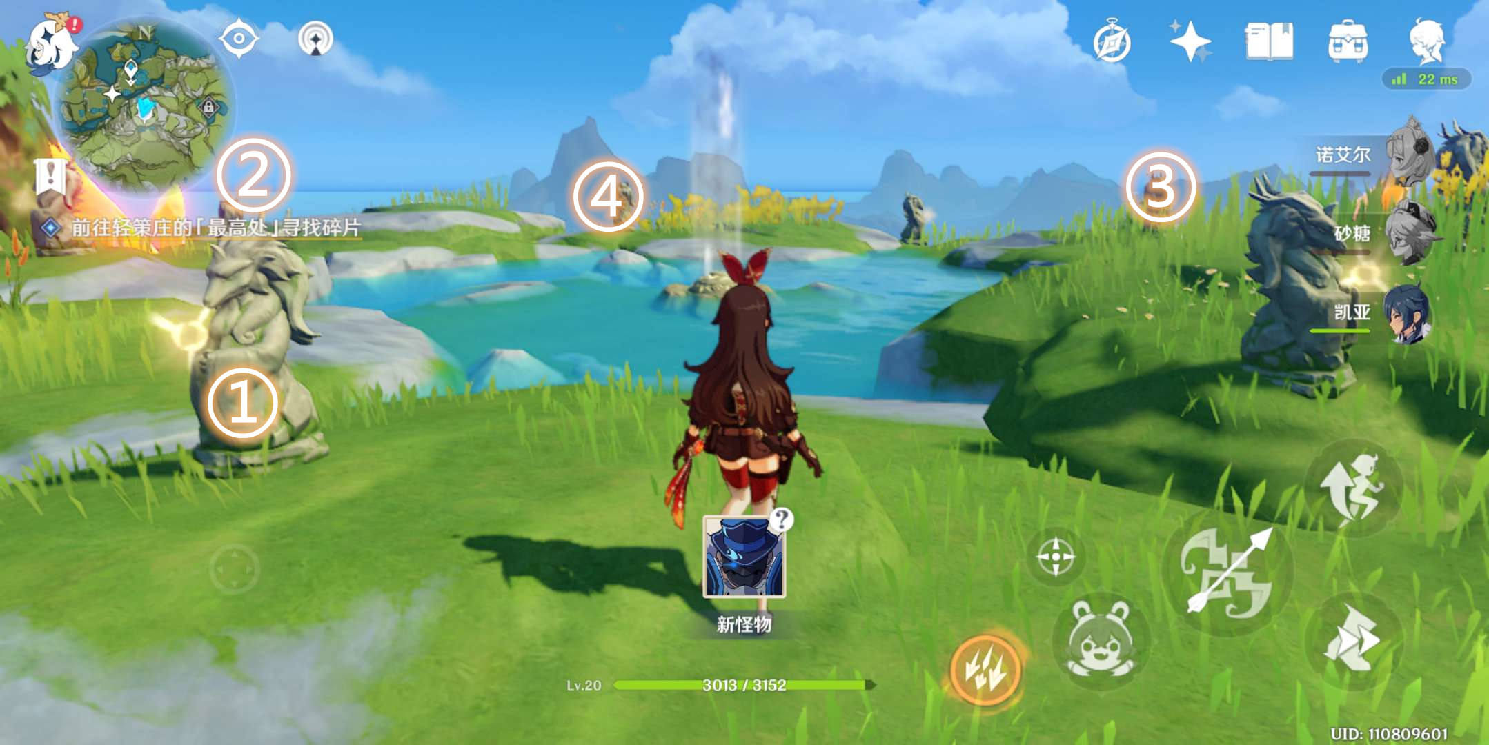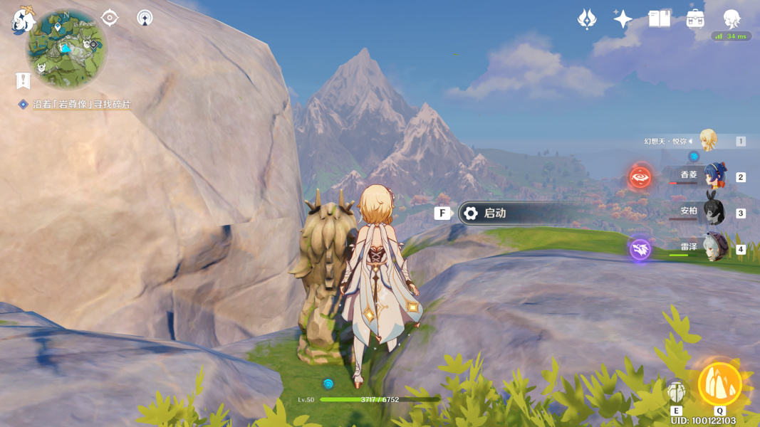 5、对话完之后,传送到轻策庄的传送点,过去与若心奶奶对话,她要求我们沿着岩樽像寻找碎片。