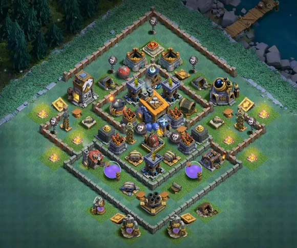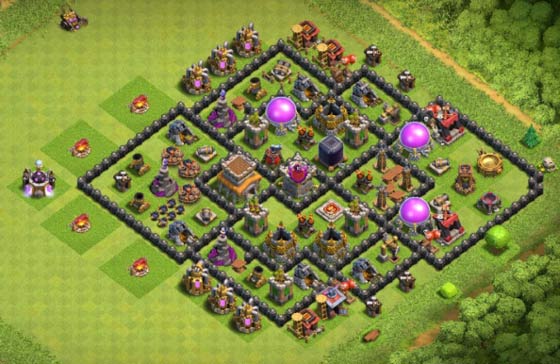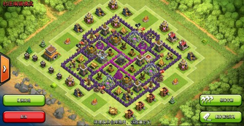 最外的箭塔和炮塔没有阻挡,狭小位置放置陷阱,法师塔、迫击炮活力均衡,防空塔三角之势、资源库分离。黑水与部落城堡在中间,防止援兵被偷袭。