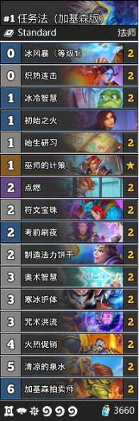 任务法的胜利手段,大部分时候都是做完任务增加法强伤害,通过无限的点燃法术打死对手,除非对手术士血量太低被你直伤斩杀了。因此,笔者认为任务法获胜关键就是如何运营好手牌去做完三系法术的任务,以及把握好过牌与解场的节奏。任务法有一定的操作难度,要求玩家对对手的节奏点要比较清晰。加基森版本的任务法在打过咒术洪流之后可以利用加基森一个回合内打出奇迹操作的感觉,是上限比较高的构筑,受到高分段玩家的青睐,也在近期中的特级大师赛频频出现。