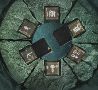 2、门旁边有一个机关,移动方块到正确的位置上发光,机关解开方式如下图,获得一个轮状零件。