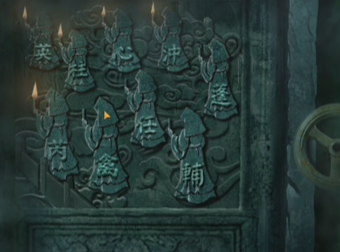 12、切换女性视角,机巧阁龙头上面宝石颜色如下图,得到玉印,千书阁桌上有印泥,获得印泥玉印,屍解居门联缺少了一个字,把它盖在屍解居右边的门联上,获得猴子雕像。