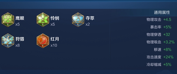 3、第一套铭文:10红月、8狩猎+2夺萃、5鹰眼+5怜悯