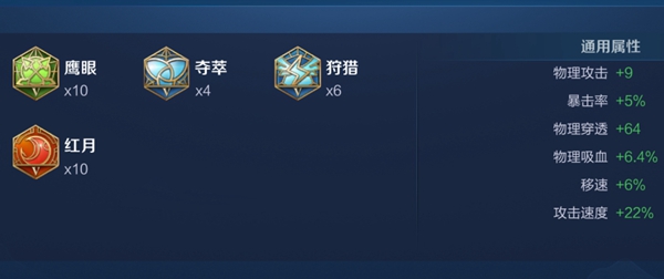 4、第二套铭文搭配:10红月、6狩猎+4夺萃、10鹰眼