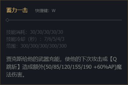 1、贾克斯主W副E,W技能是让贾克斯的下一次攻击或者Q技能可以造成额外的伤害。