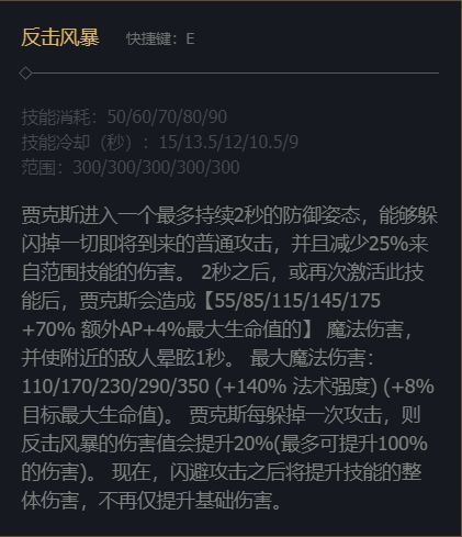 2、E技能是进入防御姿态,躲闪一切普通攻击,对范围技能免伤,2秒后或者再次施放E技能可以对敌人造成伤害并且眩晕敌人。