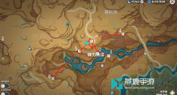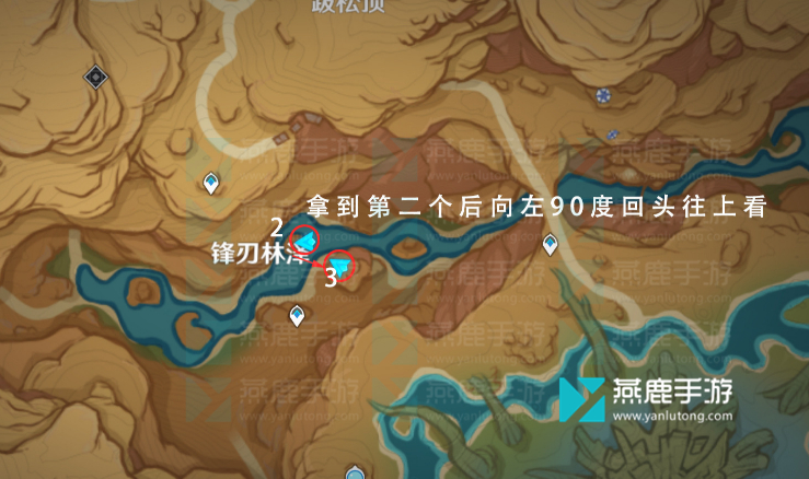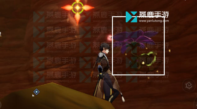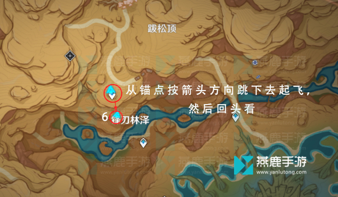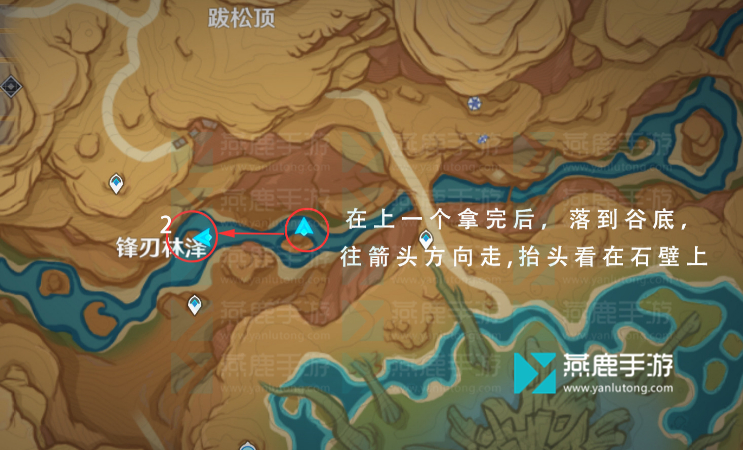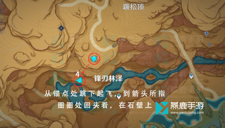 4、忧昙花④。传送锋刃林泽上方锚点,往下飞,到箭头位置回头看,在山壁上。