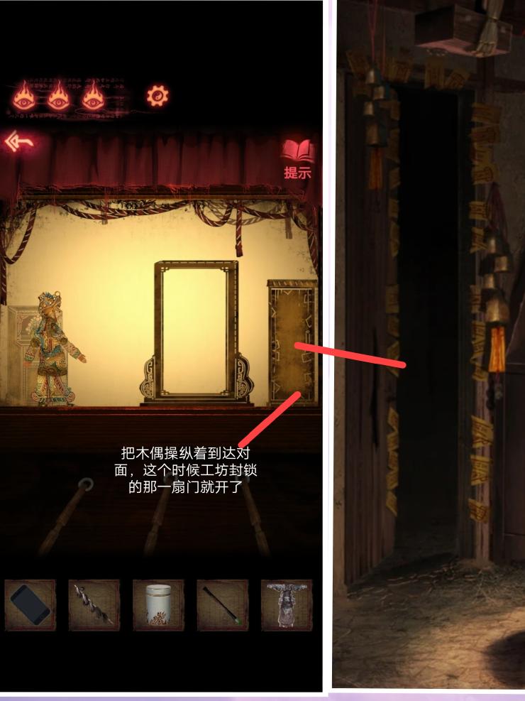 8、然后按照这个密码拿到厚底靴,按照图四:把靴子,马鞭,戏服放在那个位置,解除封印.皮影人偶便可以活动了