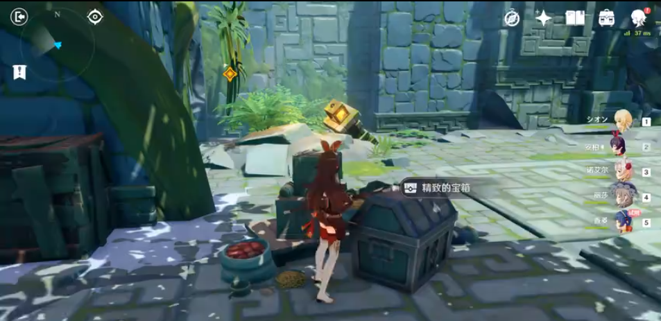 2、进入之后,可以看到一个元素方碑,方碑旁边有小怪,先把小怪清除,香菱扔锅巴或者安柏射箭激活,即可打开大门。