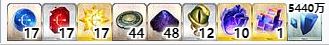 总计:弓之辉石*17、弓之魔石*17、弓之秘石*17、八连双晶*15、智慧之圣甲虫像*6、真理之卵*11、悠久果实*15、传承结晶*1、量子*5440万