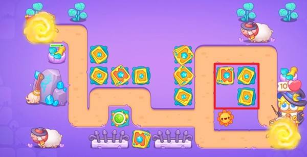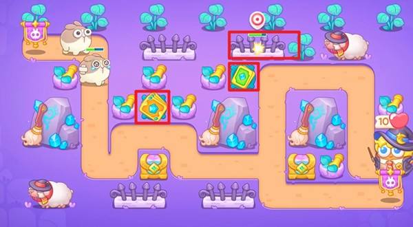 2、在兔子波次的间隔中,我们做掉左上角的一部分道具,这样我们就可以放置更多炮塔来对付出口处的兔子了。