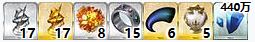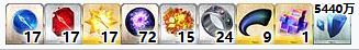 总计:枪之辉石*17、枪之魔石*17、枪之秘石*17、疯狂的残渣*72、八连双晶*15、巨人的戒指*24、混沌之爪*9、传承结晶*1、量子*5440万