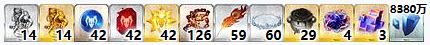 总计:狂阶银棋*14、狂阶金像*14、愚者之锁*18、凤凰羽毛*11、黑兽脂*5、咒兽胆石*4、量子*220万