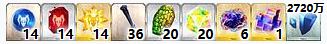 总计:狂之辉石*14、狂之魔石*14、狂之秘石*14、宵泣之铁桩*36、太阳皮*20、以太蓄光体*20、咒兽胆石*6、传承结晶*1、量子*2720万