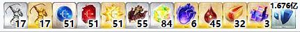 总计:弓阶银棋*17、弓阶金像*17、祸罪之箭头*10、以太蓄光体*12、蛮神心脏*2、起源的胎毛*5、量子*440万